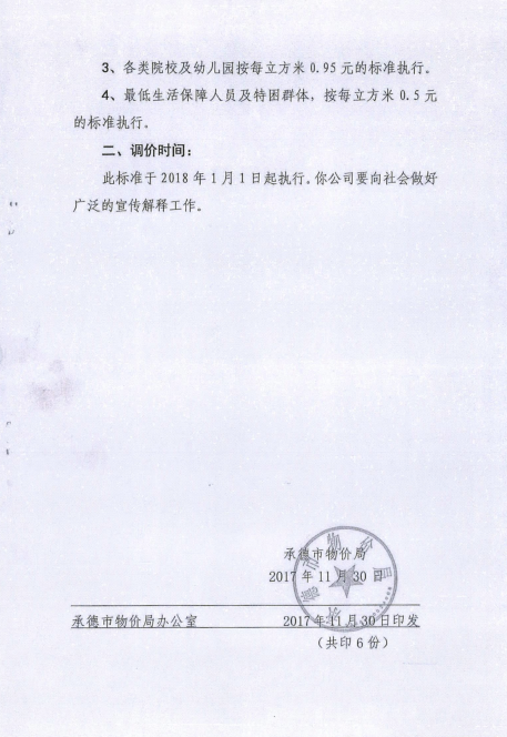 《承德市物價局關(guān)于調(diào)整市區(qū)污水處理收費標(biāo)準(zhǔn)的通知》承價字【2017】60號